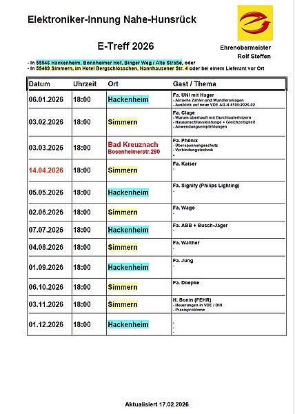 Termine E-Treff 2026 der Elektroniker-Innung Nahe-Hunsrück